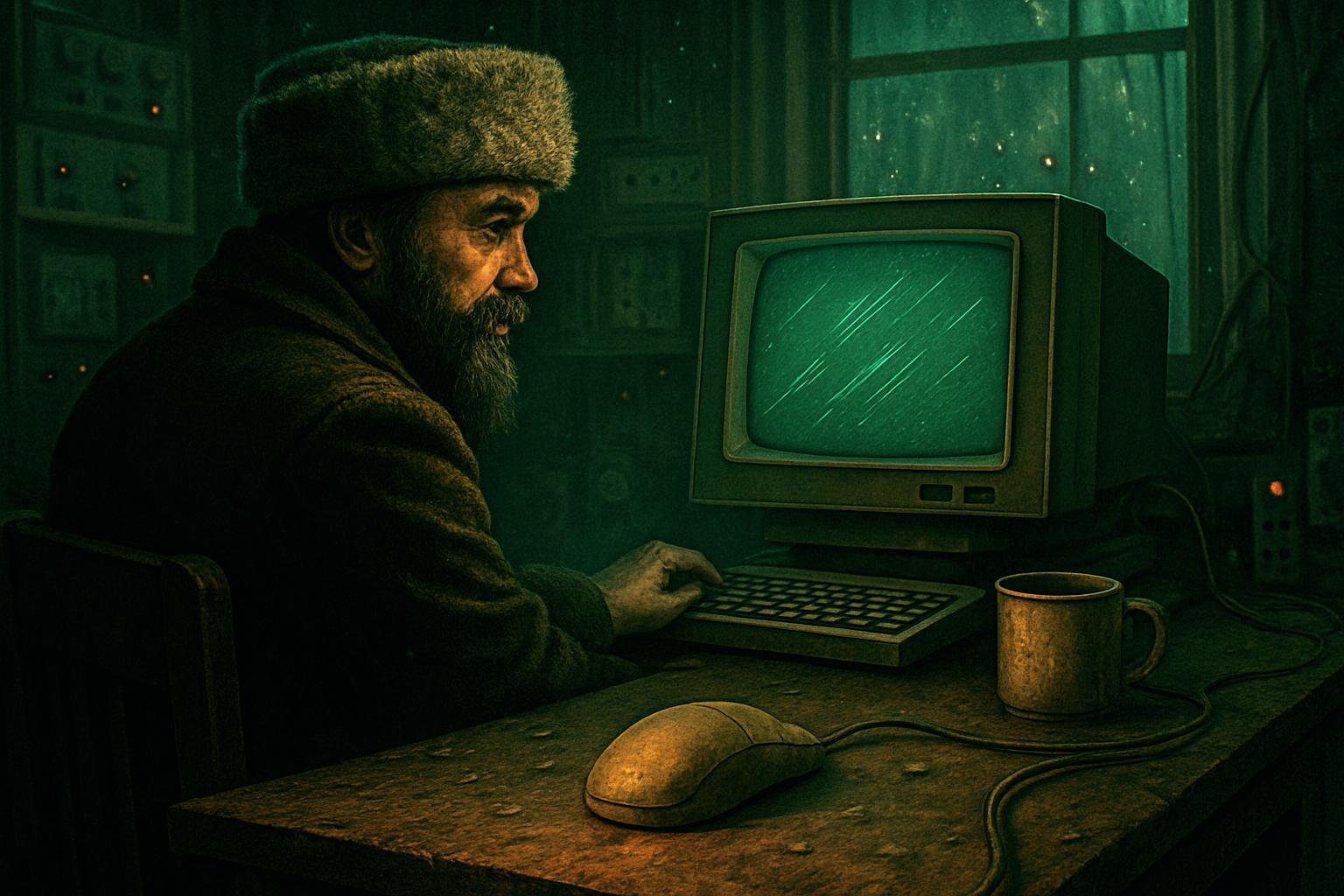 Entra nel laboratorio spingendo piano la porta con il gomito, poi posa il colbacco: un errore geografico diventato emblema di coerenza involontaria, perché nessuno ha mai trovato un posto più sbagliato dove farlo stare. È un oggetto fuori contesto, e per questo perfetto, come certe idee che funzionano solo se non dovrebbero. Lo zio appoggia una mano sulla scrivania, guarda i cavi, il monitor: ogni cosa sembra riconoscerlo senza sorpresa, come se tornasse da un’assenza prevista.